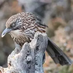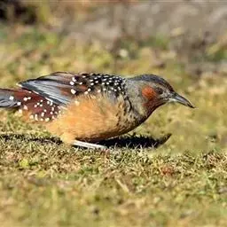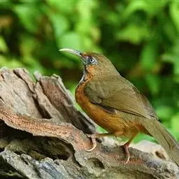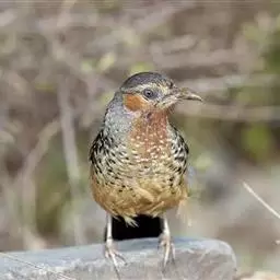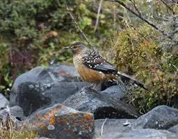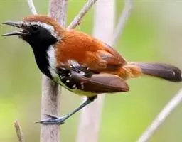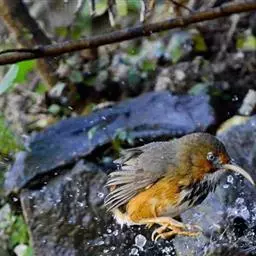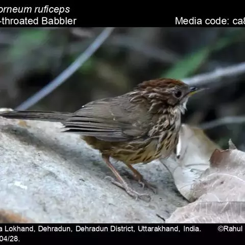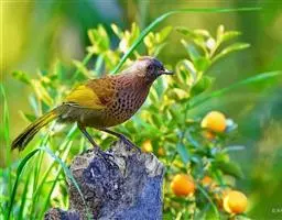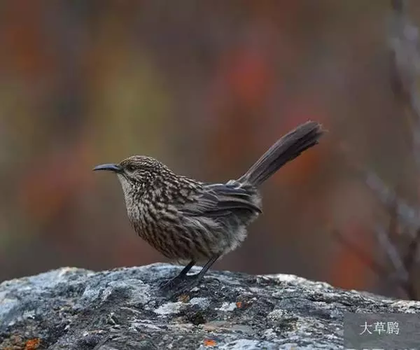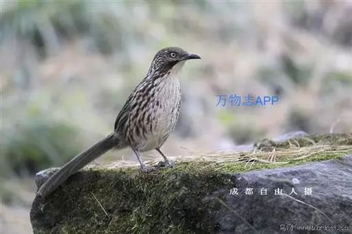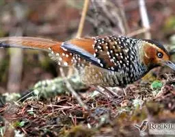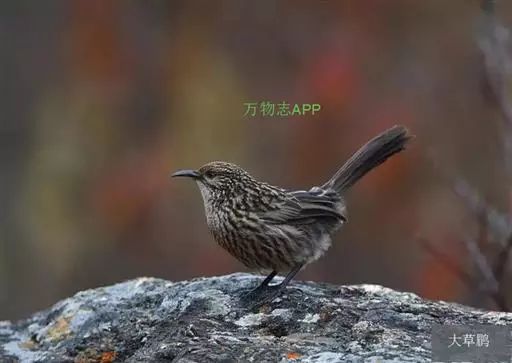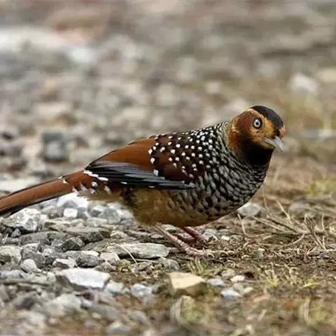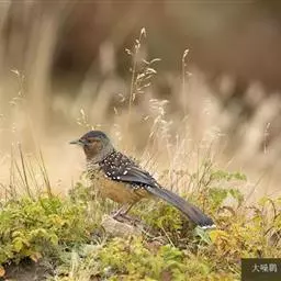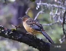 大噪鹛:中型鸟类,体长32-36厘米。额至头顶黑褐色,背栗褐色满杂以白色斑点,…