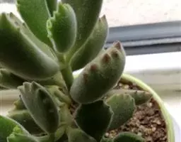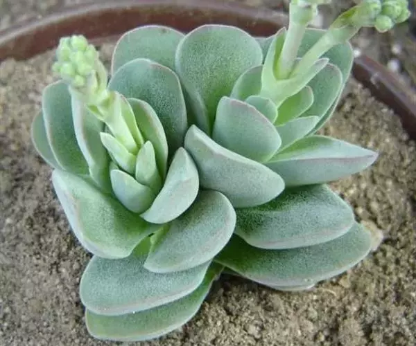 植株密集丛生,肥厚的绿白色叶对生且紧密排列,叶面粗糙有微细颗粒。叶缘强光下会微红,无叶尖,叶片轻微有皱褶。花多簇生,小花乳白色,五角型的微型花瓣。