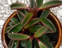 红沿椒草 也称沿边豆瓣绿、红边豆瓣绿,也为圆叶豆瓣绿的变种。植株直立生长,有肉质短茎,叶片革质,宽卵形,叶色深绿,有光泽,具短柄,茎、叶柄、叶缘以及部分中脉均为美丽的深红色,穗状花序浅黄色。