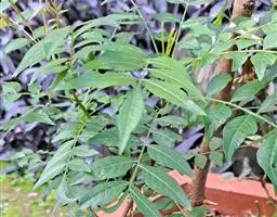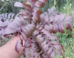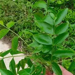 奇数羽状复叶互生,常螺旋状排列,有小叶4-6对,叶轴圆柱形,被微柔毛;叶柄长7-14厘米,被微柔毛,近基部膨大,半圆形,上面平;小叶膜质至薄纸质,卵形或卵状椭圆形或长圆形,长6-13厘米,宽3-6厘米,先端急尖或渐尖,基部偏斜,圆形或阔楔形,全缘,叶面通常无毛或仅沿中脉疏被微柔毛,叶背沿脉上被平展黄色柔毛,稀近无毛,侧脉10-15对,两面略突;小叶柄长4-7毫米,上面具槽,被柔毛。