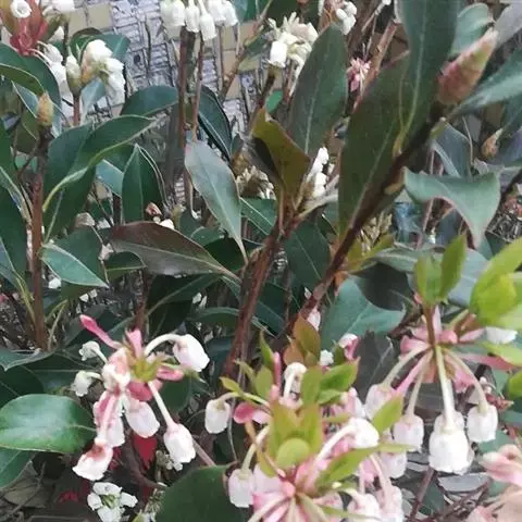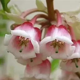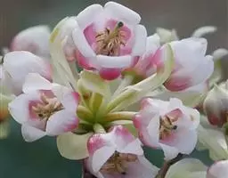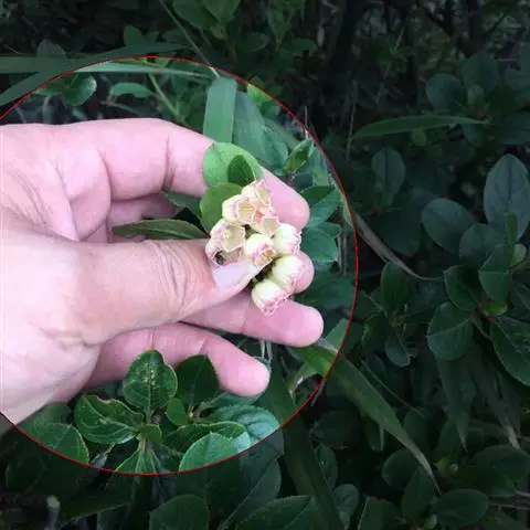 花数朵组成顶生伞形花序;花梗长8-12毫米;花萼盘状,小,绿色,上部5裂,裂片三角形,长2-3毫米;花冠白色,坛形,长8-9毫米,宽6-7毫米,近口部缢缩,5裂,裂片卵状三角形,长1-1.2毫米;雄蕊10,花药具2芒;花柱丝状,内藏。
