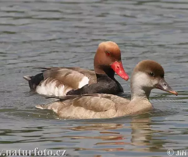赤嘴潜鸭(学名:Netta rufina)俗称大红头,是大型鸭类,个体比绿头鸭小,体长45-55厘米,体重1千克左右。雄鸟头浓栗色,具淡棕黄色羽冠。上体暗褐色,翼镜白色,嘴赤红色。下体黑色,两胁白色,特征极明显,野外容易辨别。雌鸟通体褐色,头的两侧、颈侧以及颏和喉灰白色,飞翔时翼上和翼下大型白斑极为醒目。栖息在开阔的淡水湖泊、水流较缓的江河、河流与河口地区,也常出现在公路两侧的水泡中,特别是有水边植物和水较深的淡水湖泊最为喜欢。主要通过潜水取食,也常尾朝上、头朝下在浅水觅食。觅食多在清晨和黄昏。食物主要为水藻、眼子菜和其他水生植物的嫩芽、茎和种子,有时也到岸上觅食青草和其他一些禾本科植物种子或草子。主要分布于欧洲中部、亚洲中部,从多瑙河流域经土耳其、黑海、里海、吉尔吉斯到西西伯利亚,往南到蒙古西部、伊朗、叙利亚北部,也有少量繁殖在西班牙东部、法国南部、欧洲北部,一直到丹麦、荷兰。