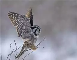 长尾鸮(学名:Surnia ulula)体长35-40厘米,体重247-375克,是一种中等大小及夜间活动的猫头鹰,是猛鸮属下的唯一物种。喙坚强而钩曲。嘴基蜡膜为硬须掩盖。翅的外形不一,第五枚次级飞羽缺。尾短圆,尾羽12枚,有时仅10枚。脚强健有力,常全部被羽,第四趾能向后反转,以利攀缘。爪大而锐。尾脂腺裸出。无副羽,间或留存。耳孔周缘具耳羽,有助于夜间分辨声响与夜间定位。