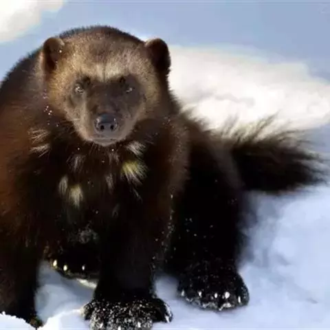 貂熊是现存最大的陆生鼬科动物,貂熊在身体外形上介于貂与熊之间,身体和四肢粗壮像熊,但有一条长尾则象貂。身体不大, 体型粗壮,连头带尾长约80~100厘米,尾长18厘米左右,体重达8~25千克。毛被棕褐色,体侧向后沿臀周有一淡黄色半环状宽带纹,状似“月牙”,故有“月熊”之称; 由于两肋至后腿根部的毛延长,长度可达12厘米,如同围着一圈长长的“毛裙子”,加上它蓬松的尾毛,在密林中自由跳窜和自高处跳下时烈烈飘动,宛如飞翔,故貂熊又被称为“飞熊”。 尾巴粗大,尾毛黑褐色,呈丛穗状下垂。头大耳小,背部弯曲,四肢短健,跖行性,爪长而直,不能伸缩。