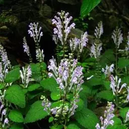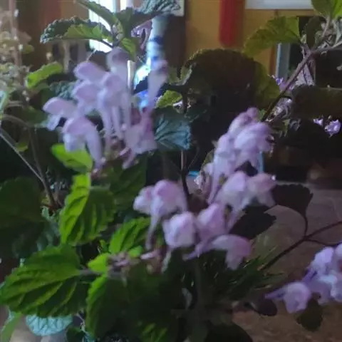 冠檐紫红色,冠管淡红或白色;花长1.5-1.7厘米,外被微柔毛;花冠管长1—1.2厘米,前方基部曲膝状,向上增大;冠檐上唇盔状,直伸,卵圆形,先端微凹,下唇中裂片三角状卵圆形,先端微凹,侧裂片卵圆形。花丝中部以下被纤毛。