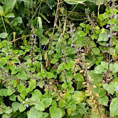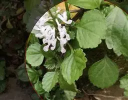 叶通常4对,卵圆形或椭圆状卵圆形,长3—11厘米,宽2—4.5厘米,先端渐尖或短渐尖,基部圆形,边缘疏生极不明显的小齿或浅波状或近全缘,两面无毛,背面密生小凹腺点,侧脉约4对;叶柄水红色,长0.7—1.2厘米,被具腺柔毛。总状花序顶生间或腋生,长9—15厘米,花对生,花梗长2—2.5毫米,与序轴密微柔毛及具腺柔毛;苞片退化。花萼于花时常呈紫红色,长约2毫米,外被微柔毛,盾片开展,半圆形,高1.5毫米。