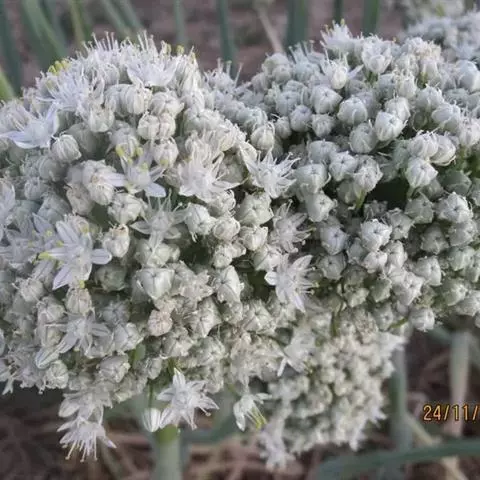 原植物 蒜为二年生草本,高60~80厘米,有强烈蒜臭气;鳞茎扁圆球形,粗大,分为6~10肉质、瓣状小鳞茎,少数不分瓣,全部包于数层银白色或紫红色的鳞皮内,每一瓣也有薄膜包裹,底座生有众多细长的白色须根。叶数枚,基生,阔条形或条状披针形,扁平或微凹,宽达2.5厘米,顶端长尖,下部成长鞘,淡绿色,肉质,表面带白粉。花茎直立,长圆柱形,长于叶,高55~100厘米;佛焰苞浅绿色,有长喙,长7~10厘米;伞形花序顶生,花小而稠密;具膜质长苞片l~3,浅绿色;花被片6,披针形,粉红色;雄蕊6,白色,基部合生,与花被贴生;子房长圆状卵形,花通常不育。蒴果。种子黑色。花间常杂生珠芽。花期5~6月。蒜耐寒,耐旱,生命力强。 蒜