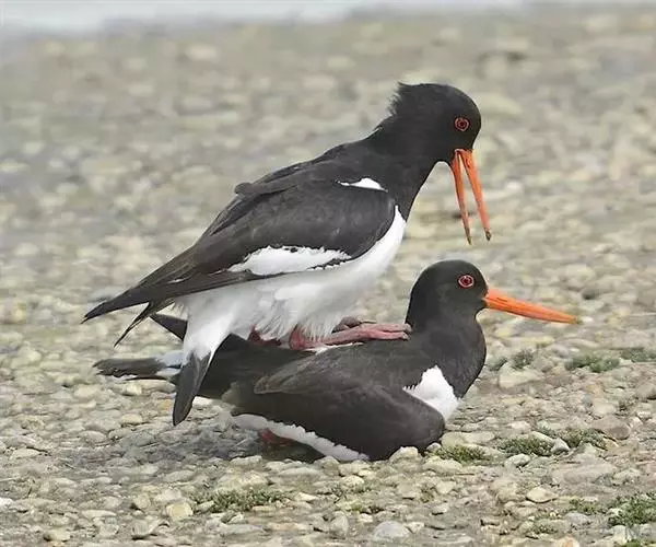 在越冬期间蛎鹬经常发出低沉的“哼唱”,有的还会有精彩的“蝶飞”表演,这实际上是在与同伴联络或在确立自己的主导地位及领域范围。