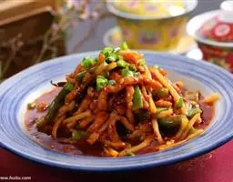 京酱肉丝,是一道知名度很高的菜肴,它是北京菜中的经典代表菜之一。制作时选用猪瘦肉为主料,辅以甜面酱…