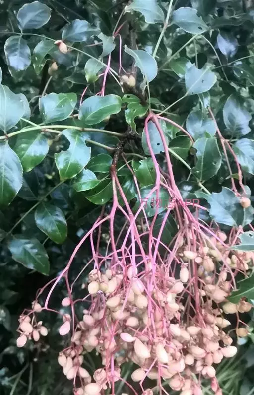 圆锥花序顶生,花梗长达21厘米,花多,较密集,黄白色,径4-5毫米,萼片与花瓣均5,椭圆形,萼片宿存,花盘盘状,心皮3,分离。蓇葖果长1-2厘米,每一花发育为1-3个蓇葖,果皮软革质,紫红色,有纵脉纹,种子近圆形,径约5毫米,假种皮肉质,黑色,有光泽。