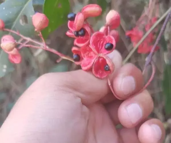 野鸦椿,学名为Euscaphis japonica (Thunb.)Dippel,别名酒药花、鸡肾果(广西),鸡眼睛(四川),小山辣子、山海椒(云南),芽子木(湖南),红椋(湖北、四川)。 为省沽油科落叶小乔木或灌木,是一种极具利用潜力的观赏植物。其根价药用值为解毒,清热,利湿。用于感冒头痛,痢疾,肠炎。其果药用价值为祛风散寒,行气止痛。用于月经不调,疝痛,胃痛。
