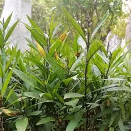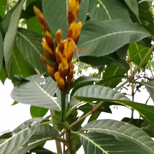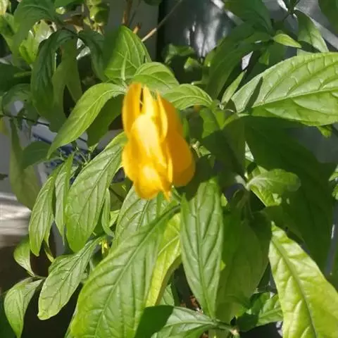 金脉爵床又称金叶木,为爵床科黄脉爵床属多年生常绿观叶植物。金脉爵床为直立灌木状,盆栽种植株高一般50-80厘米。多分枝,茎干半木质化。叶对生,无叶柄,阔披针形,长15-30厘米、宽5-10厘米,先端渐尖,基部宽楔形,叶缘锯齿;叶片嫩绿色,叶脉橙黄色。夏秋季开出黄色的花,花为管状,簇生于短花茎上,每簇8-10朵,整个花簇为一对红色的苞片包围。