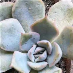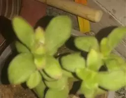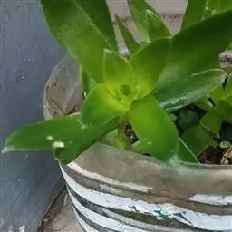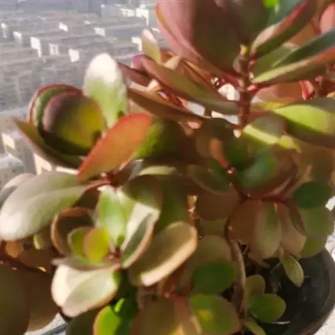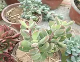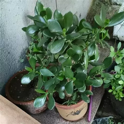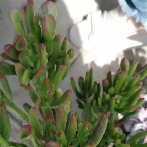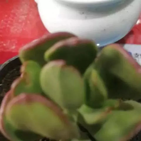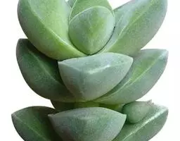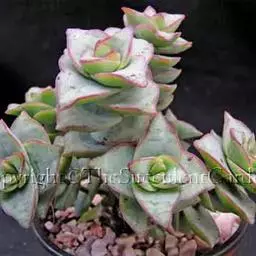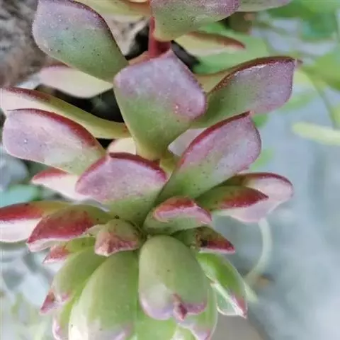 多年生肉质草本植物,植株呈亚灌术状高约60厘米,具小分枝,茎肉质以后稍木质化。肉质叶灰绿至浅绿色,叶缘稍具红色,交互对生,卵圆状三角形,无叶柄,基部连在一起,幼叶上下叠生,战叶上下有少许间隔。叶长1.5~2.5厘米,宽0.9~1.3厘米,花白色,4~5月开放。