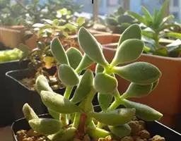 生长期宜保持土壤湿润,避免积水,否则会造成植株根、基部腐烂。每15天左右施一次腐熟的稀薄液肥,以促进植株的生长。冬季放在室内阳光处,如果能维持10℃以上,可继续浇水,酌情施些肥,使植株继续生长;如果保持不了这么高的温度,控制浇水,使植株休眠,也能耐5℃左右的低温。夏季高温时植株生长缓慢或完全停止,可放在通风良好处养护,适当遮光,避免烈日曝晒,并停止施肥,节制浇水,也不要长期雨淋,以免植株腐烂。串钱景天在栽培中应经常修剪,剪去过乱的枝条,以保持株形的优美。当植株生长过于拥挤时可在春季或秋季换盆,种植盆应根据植株的大小进行选择,花盆过大或过小都不利于其生长。此外,还要考虑花盆的美观性。盆土要求疏松肥沃,具有良好的排水透气性,可用腐叶土、园土、粗砂或蛭石混合土栽种。