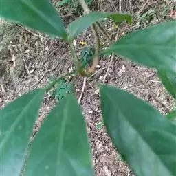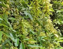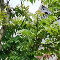 奇数羽状复叶长25-30厘米,叶柄及叶轴幼时被有极短腺毛及腺体;小叶通常5~9枚,稀3枚,椭圆状卵形至长椭圆形,长约6-15厘米,宽约3-6厘米,顶端钝圆或急尖、短渐尖,基部歪斜、近于圆形,边缘全缘或在幼树上者具稀疏细锯齿,上面深绿色,无毛,下面淡绿色,侧脉11-15对,腋内具簇短柔毛,侧生小叶具极短的小叶柄或近无柄,生于下端者较小,顶生小叶常具长约3~6厘米的小叶柄。