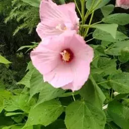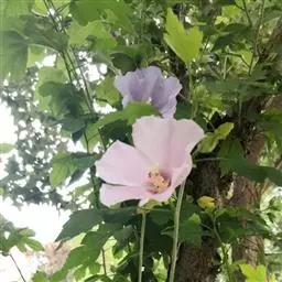 木槿(学名:Hibiscus syriacus Linn.):落叶灌木,高3-4米,小枝密被黄色星状绒毛。叶菱形至三角状卵形,长3-10厘米,宽2-4厘米,具深浅不同的3裂或不裂,先端钝,基部楔形,边缘具不整齐齿缺,下面沿叶脉微被毛或近无毛。花单生于枝端叶腋间,花萼钟形,长14-20毫米,密被星状短绒毛,裂片5,三角形;花朵色彩有纯白、淡粉红、淡紫、紫红等,花形呈钟状,有单瓣、复瓣、重瓣几种。外面疏被纤毛和星状长柔毛。蒴果卵圆形,直径约12毫米,密被黄色星状绒毛;种子肾形,背部被黄白色长柔毛。花期7-10月。
