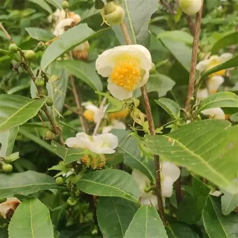 在热带地区也有乔木型茶树高达15—30米,基部树围1.5米以上,树龄可达数百年至上千年。栽培茶树往往通过修剪来抑制纵向生长,所以树高多在0.8—1.2米间。茶树树龄一般在50—60年间。茶树的叶子呈椭圆形,边缘有锯齿,叶间开五瓣白花,果实扁圆,呈三角形,果实开列后露出种子。