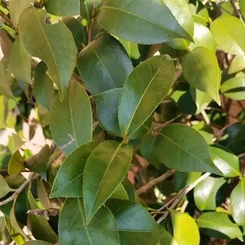 灌木或小乔木,嫩枝无毛。叶革质,长圆形或椭圆形,长4-12厘米,宽2-5厘米,先端钝或尖锐,基部楔形,上面发亮,下面无毛或初时有柔毛,侧脉5-7对,边缘有锯齿,叶柄长3-8毫米,无毛。花1-3朵腋生,白色,花柄长4-6毫米,有时稍长;苞片2片,早落;萼片5片,阔卵形至圆形,长3-4毫米,无毛,宿存;花瓣5-6片,阔卵形,长1-1.6厘米,基部略连合,背面无毛,有时有短柔毛;雄蕊长8-13毫米,基部连生1-2毫米;子房密生白毛;花柱无毛,先端3裂,裂片长2-4毫米。蒴果3球形或1-2球形,高1.1-1.5厘米,每球有种子1-2粒。花期10月至翌年2月。