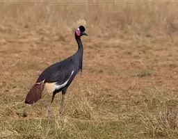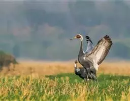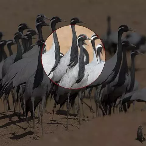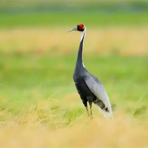 蓑羽鹤大型涉禽,体长68~92厘米,是鹤类中个体最小者。通体蓝灰色,眼先、头侧、喉和前颈黑色,…