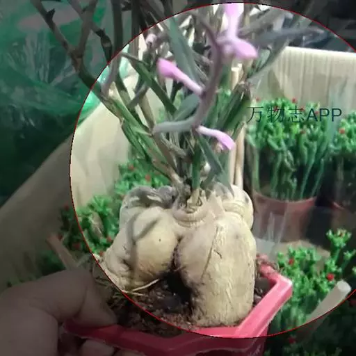 人参大戟,是典型块茎状多肉植物的代表性种类之一。黄褐色人参状茎基膨大多肉,顶生灰绿色柔枝,青绿色狭形小叶交互对生,枝端缀满桃色小花。形态精巧灵秀、古咄奇巧。可与柔美雅秀、风姿宜人的“人参榕”盆景相媲美,深受爱好者的青睐。