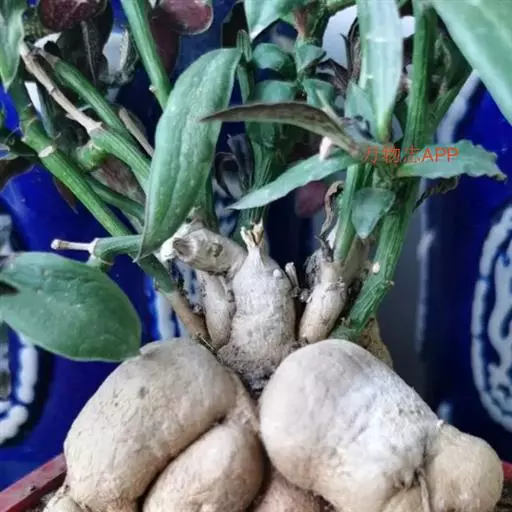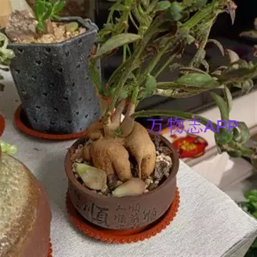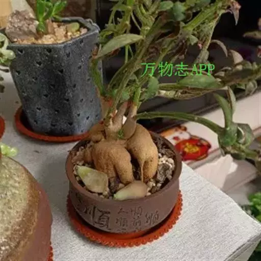 人参大戟可称为“三观”植物,即:观花、观叶、观根。尤其是人参大戟的根茎可于“人参榕”媲美。人参大戟,茎干状多肉花卉。植株茎基膨大,呈球状、地瓜状或形似人参, 表皮灰白色至黄褐色。其顶端长有细柱状的茎。分支横斜生长,表皮褐、绿色,有灰白色纵向条纹。叶片椭圆形,,正面青绿色带紫晕,背面紫红色,有淡绿色花纹,交互对生。花期夏、秋季,小花粉红色,生在茎、叶腋间。