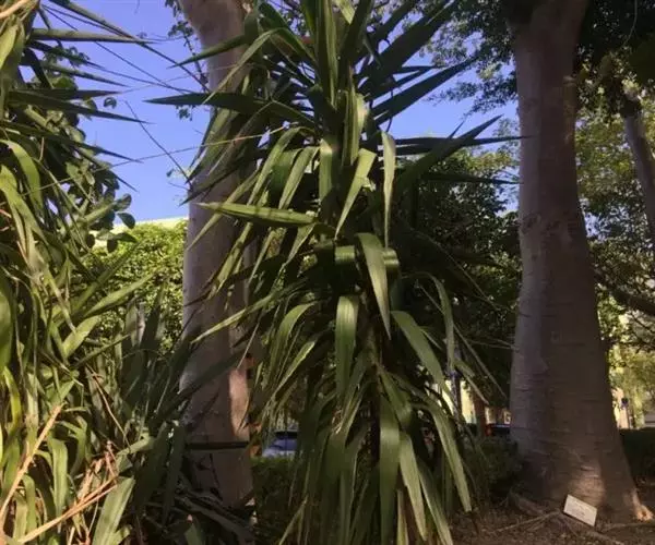 剑叶龙血树茎粗大,分枝多,树皮灰白色,光滑,叶聚生在茎、分枝或小枝顶端,花序轴密生乳突状短柔毛,花丝扁平,部有红棕色疣点;花柱细长。