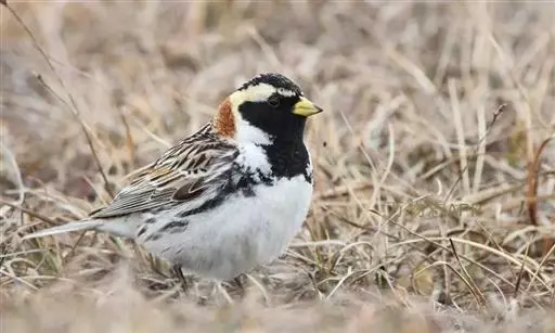 铁爪鹀(学名:Calcarius lapponicus):共有5个亚种。体重20-34克,体长140-178毫米,属大型鹀类。头、颈、喉和胸侧均黑色;眉纹及颈侧白色;下颈及翕浓栗赤色,背部锈赤色发达,并具黑色纵斑;上胸黑,下体余部白色;两胁有纵斑。后趾爪特长;雄鸟的头、喉和胸呈黑色。体形大小和鹀属相似。嘴形似鹀属呈圆锥形;翅长而尖,前三枚初级飞羽约相等并最长,翅式:2=3>4;尾长等于翅的三分之二;跗蹠长于中趾和爪;后爪长而细,近乎直,约等或长于后趾;前三趾的诸爪甚平扁。