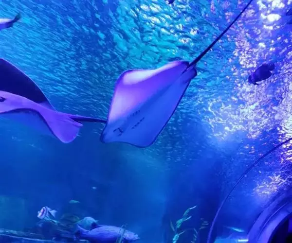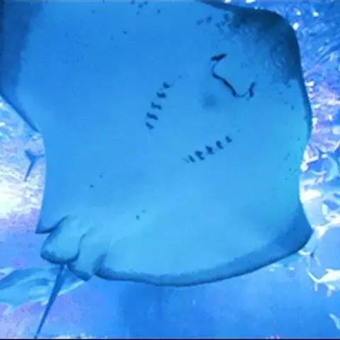 蝠鲼又名魔鬼鱼,因它们的游姿与夜里飞行的蝙蝠有些相似而得名,是软骨鱼纲、蝠鲼科几种海产属鱼类的统称。蝠鲼的体型呈不规则的椭圆形,体盘一般50~100厘米左右,最大可达8米以上,重达3吨。2008年8月,我国海南的一位渔民就曾捕获了一条1500千克重的超级“魔鬼鱼”。身体扁平,宽大于长,一头宽大平扁,吻端宽而横平,胸鳍肥厚如翼状,头前有胸鳍分化出的两个突出的头鳍,位于头的两侧,尾细长如鞭,有一个小型的背鳍。有些种类的尾部有一个或多个毒刺,口宽大,牙细而多,像铺石一样排列,上、下颌具牙带,但上颌可能没有牙齿,鼻孔位于口前两侧,出水孔开口于口隅,喷水孔为三角形,较小,位于眼后,距眼有一相当距离,鳃孔宽大,腰带深弧形,正中延长尖突。蝠鲼背面多为黑色或灰蓝色,腹面灰白且散布着零星的深色斑点,体型就像一张巨大的毯子,再加上其身体后部有一条又圆又细的尾巴,就像是一只“海上风筝”。蝠鲼有洄游的习惯,所以人们不会在一个地方常年见到它。每年的6~7月,蝠鲼会洄游到福建、浙江沿海。8~9月,它们又会游到黄海,10~11月,就会游回浙江沿海,12月到次年2~3月沿原来路线洄游南下,在我国福建、浙江和黄海一带可见到它们的踪影 。