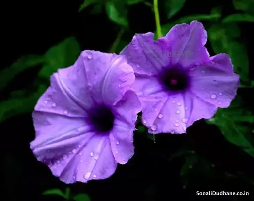 聚伞花序腋生,花序梗长2-8厘米,具1-3花,或偶有3朵以上;苞片及小苞片均小,鳞片状,早落;花梗长0.5-2厘米,有时具小疣状突起;萼片稍不等长,外方2片较短,卵形,长5-6毫米,外面有时有小疣状突起,内萼片稍宽,长7-9毫米,萼片边缘干膜质,顶端钝圆或具不明显的小短尖头;花冠紫红色、紫色或淡红色、偶有白色,漏斗状,长5-7厘米;雄蕊不等长,花丝基部稍扩大下延贴生于花冠管基部以上,被毛;子房无毛,花柱纤细,长于雄蕊,柱头2球形。
