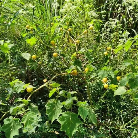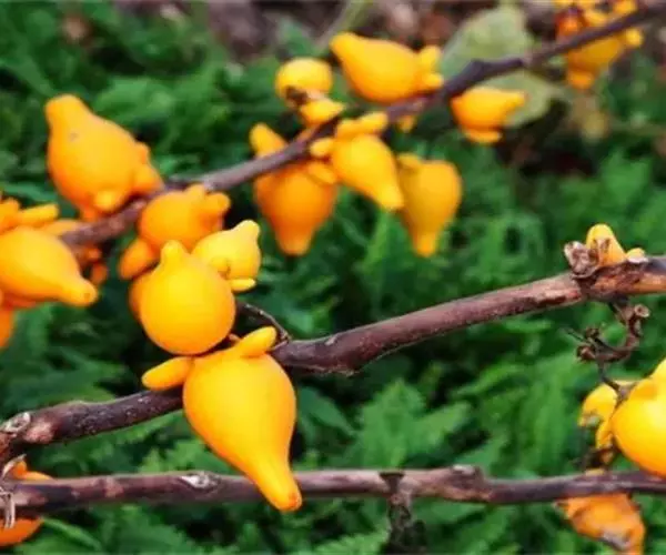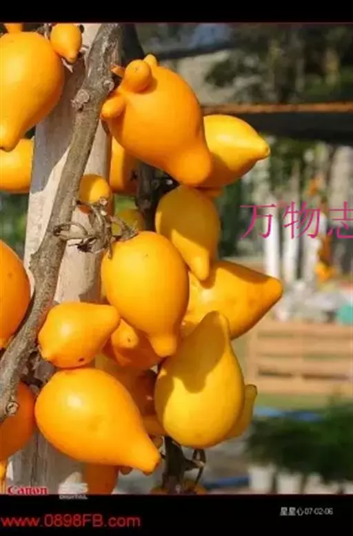 浆果倒梨状,长4.5-5.5cm,外面土黄色,内面白色,具5个乳头状凸起,种子黑褐色,近圆形压扁,直径约3mm。花果期夏秋间。