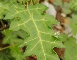叶卵形,长5-10cm,宽几与长相等,常5裂,有时3-7裂,裂片浅波状,先端尖或钝,基部微凹,两面密被亮白色极长的长柔毛及短柔毛;侧脉约与裂片数相等,在上面平,在下面略凸出,具黄土色细长的皮刺,刺长8-20mm,基部扁,具槽,先端钻形;叶柄长2.5-8cm,上面具槽,被具节的长柔毛,腺毛及皮刺。