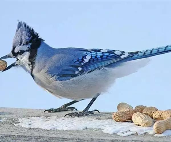 食物构成中昆虫占了约22%,其余基本上是各种果实和种子。喜爱橡子,并会选择完整的、没有被象鼻虫咬坏的橡子埋在地下,或是藏在草丛或树洞中。它们一次能运送4-5枚橡子,2-3枚在喉囊中,1枚在嘴里,而喙端亦能夹住1枚。一只冠蓝鸦在秋季一季内可运送3000-5000枚橡子。它们的这些行动功不可没,因为这些行动使得橡树在末次冰期分布得更为广泛。它们有时还会储存大量食物以备今后食用,而这种行为对环境是有益的,因为它们将食物藏好后,有时会忘记食用,这样它们的行为就有助于植物的传播。冬季,冠蓝鸦会将食物,尤其是面包和葵花籽从饲喂站定期运走,然后藏在树下和灌木丛中,以备以后食用。定期的花生、混合谷物特别是葵花籽供应能将它们吸引到饲喂架上。喜欢用爪抓住坚果,然后将壳啄开,吃里面的果仁。 [1-2]