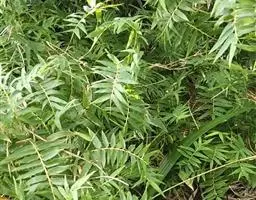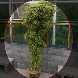凤尾竹 Raeusch. ex Schult. ’Fernleaf’ R. A. Young)是禾本科,簕竹属孝顺竹的变种。植株较高大,杆高可达6米,竿中空,小枝稍下弯,下部挺直,绿色;竿壁稍薄;节处稍隆起,无毛;叶鞘无毛,纵肋稍隆起,背部具脊;叶耳肾形,边缘具波曲状细长繸毛;叶舌圆拱形,叶片线形,上表面无毛,下表面粉绿而密被短柔毛,小穗含小花,中间小花为两性;外稃两侧稍不对称,长圆状披针形,先端急尖;内稃线形,脊上被短纤毛,花药紫色,子房卵球形,羽毛状。成熟颖果未见。原产中国,华东、华南、西南以至台湾、香港均有栽培。凤尾竹喜温暖、湿润和阳光充足的环境,耐寒。宜土层深厚、肥沃、疏松的微酸性壤土。该种观赏价值较高,宜作庭院丛栽,也可作盆景植物。全草或根入药,味淡、微苦,性寒,有清热利湿、凉血止血、消肿解毒功效,可治痢疾、泄泻等多种病症。凤尾