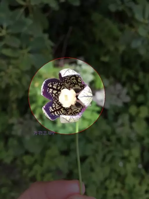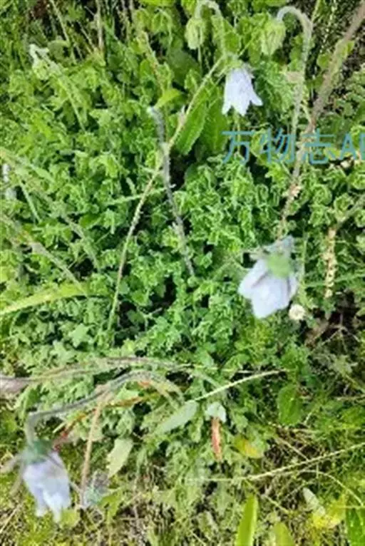花单朵,极稀数朵,着生于茎顶端,使茎呈花葶状,花微下垂;花梗长1-8厘米,或密或稀疏被毛;花萼贴生至子房中部,筒部半球状,具10条明显辐射脉,无毛或有极稀的白色柔毛,裂片间湾缺宽钝,裂片远隔,卵状披针形,长约7-20毫米,宽约2-7毫米,顶端钝或急尖,全缘,两面及边缘密被白色柔毛,或至基部渐趋于无毛,灰绿色;花冠球状钟形,淡蓝白色,内面基部常有红紫色斑,长约2-4.5厘米,直径2.5-3厘米,浅裂,裂片圆三角形,外侧顶端及脉上被柔毛;雄蕊无毛,花丝基部微扩大,长约5毫米,花药长约4-5毫米。