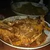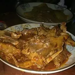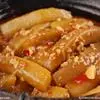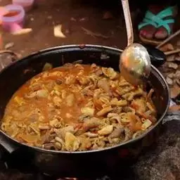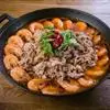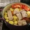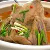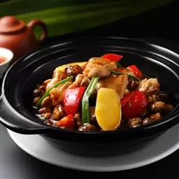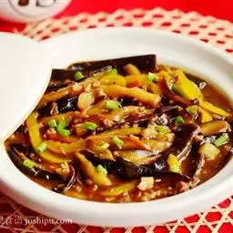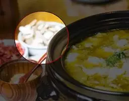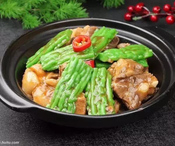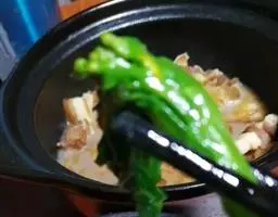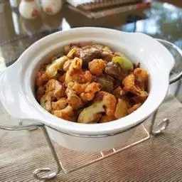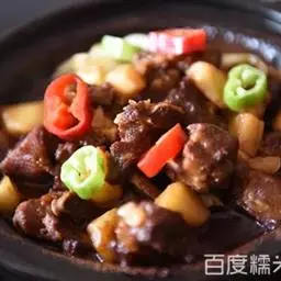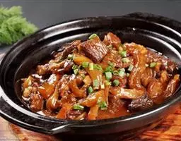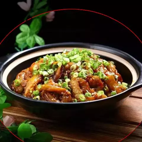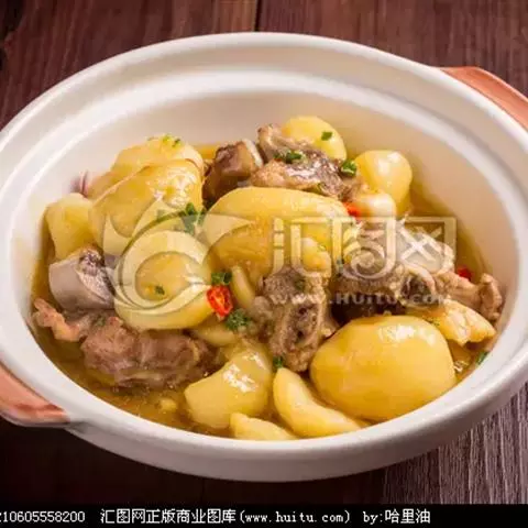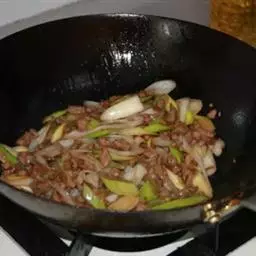 4. 烧热瓦缸下油,放入青蒜、肉排同爆,下些老抽,一碗清水,适量味精、糖、盐同煲之,煲十分钟后,加入已熟之粟子焖片刻即成。