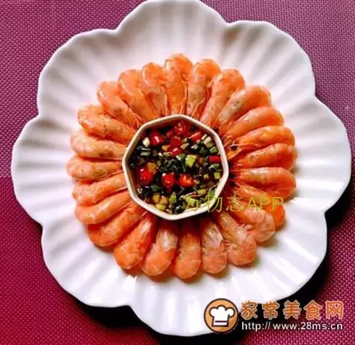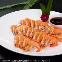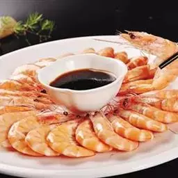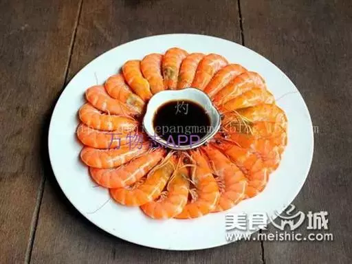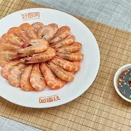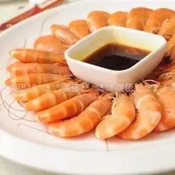 3、用旺火把清水烧开,下入鲜虾淖至熟捞起,控去水分上盘便可,跟味碟上桌。 [3-4]