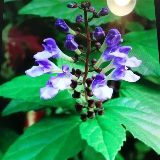 花对生,在茎或分枝顶上排列成长4-8(12)厘米的总状花序;花梗长2.5-3毫米,与序轴均被微柔毛;最下一对苞片叶状,卵圆形,长达1.7厘米,边缘具圆齿,其余苞片均细小,卵圆形至椭圆形,长3-6毫米,宽1-2.5毫米,全缘,无柄,被微柔毛。花萼开花时长约2.5毫米,被硬毛及微柔毛,果时十分增大,盾片花时高约1.5毫米,果时竖起,增大一倍。花冠蓝紫色,长1.4-1.8厘米,外疏被微柔毛,内面仅唇片被短柔毛;冠筒前方基部膝曲,其后直伸,向上逐渐增大,至喉部宽约4.5毫米;冠檐2唇形,上唇盔状,内凹,先端微缺,下唇中裂片圆状卵圆形,两侧中部微内缢,先端微缺,具深紫色斑点,两侧裂片卵圆形。雄蕊4,二强;花丝扁平,中部以下具小纤毛。花盘肥厚,前方隆起;子房柄短。花柱细长。子房光滑,4裂。