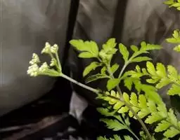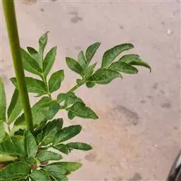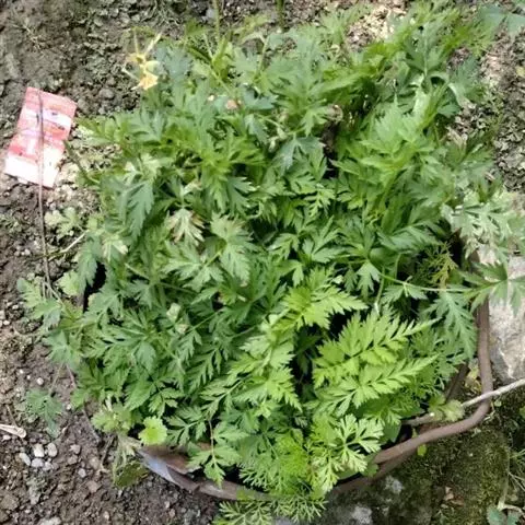 叶柄长2-7厘米,下部有窄膜质的叶鞘;叶片长卵形,1-2回羽状分裂,两面疏生紧贴的粗毛,第一回羽片卵状披针形,长2-6厘米,宽1-2.5厘米,先端渐窄,边缘羽状深裂至全缘,有0.5-2厘米长的短柄,末回裂片披针形以至长圆形,边缘有条裂状的粗齿至缺刻或分裂。