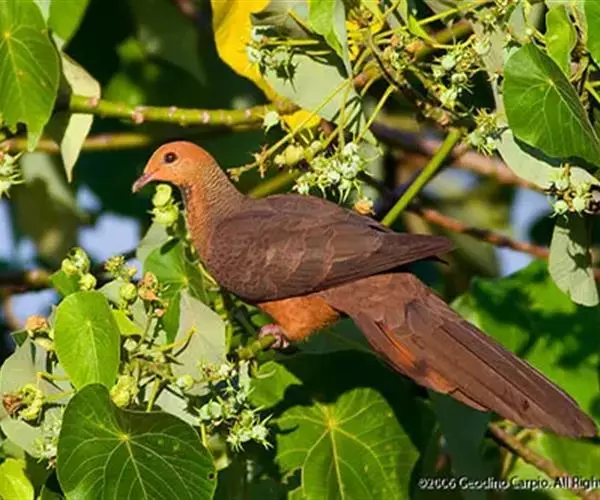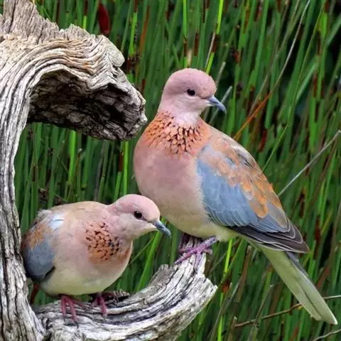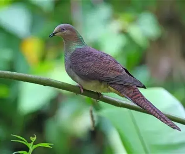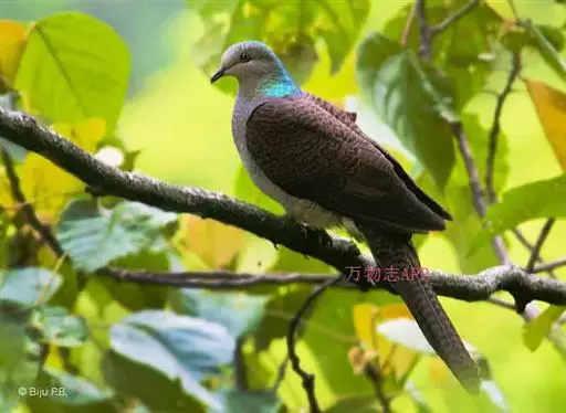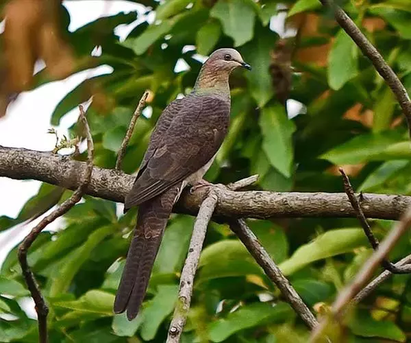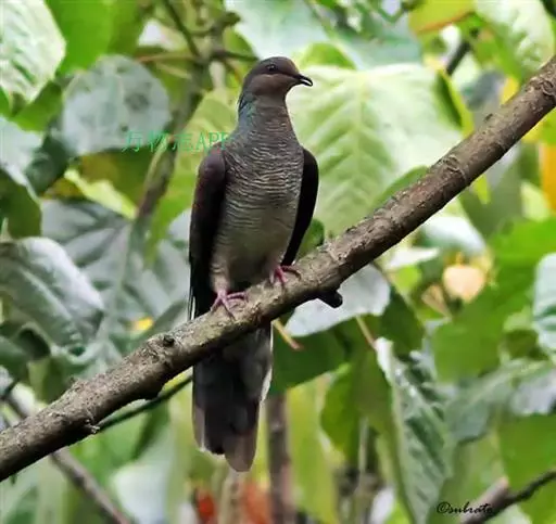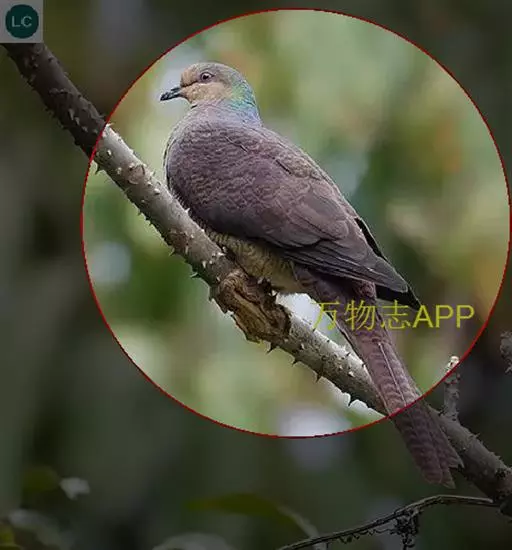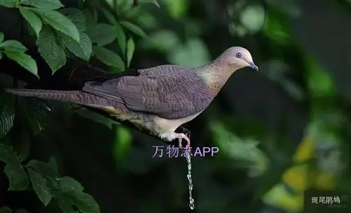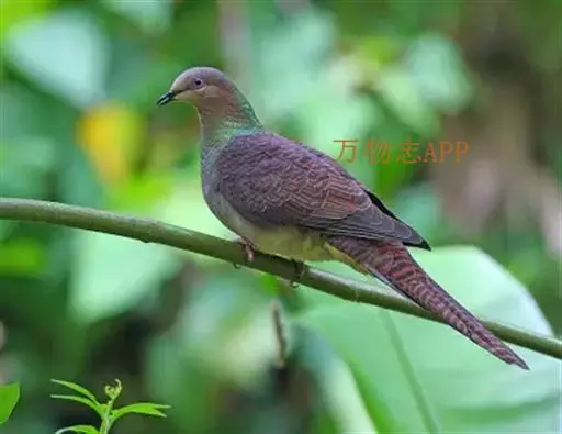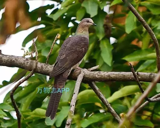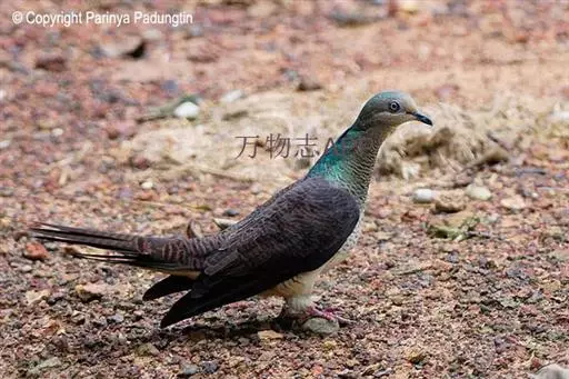 雌鸟和雄鸟相似,但上体少光泽,头顶与胸具黑褐色细横斑。尾羽较鸽类为长。