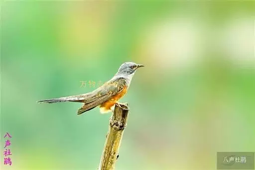 八声杜鹃(学名:Cacomantis merulinus)小型鸟类,体长21~25厘米。嘴形侧扁、尖削。雄鸟头、颈和上胸灰色,背至尾暗灰色,尾具白色端斑。胸以下淡棕栗色,上下体均无横斑。叫声为八声一度。雌鸟通体为灰黑色和栗色相间。相似种棕腹杜鹃体型较大,尾具黑色横斑和红褐色端斑,胸、腹棕栗色,腹以下白色,区别甚明显,野外不难辨别。