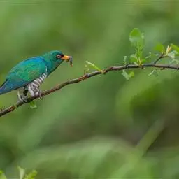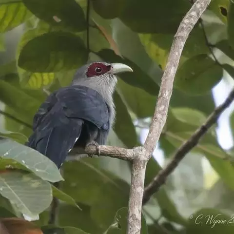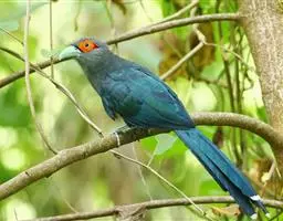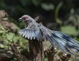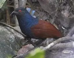 绿嘴地鹃:体形似小鸦鹃,但羽色大致绿灰;嘴绿色,头侧眼的周围有一裸区;后爪弯曲。虹膜赤红色,…