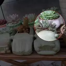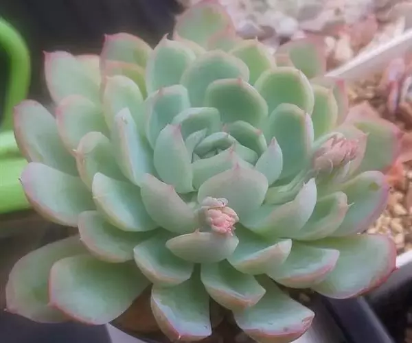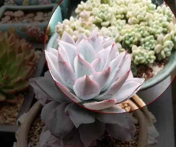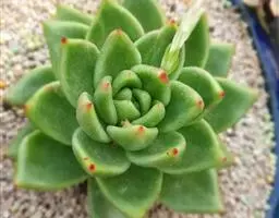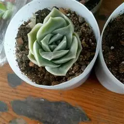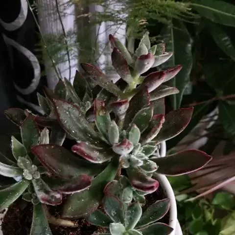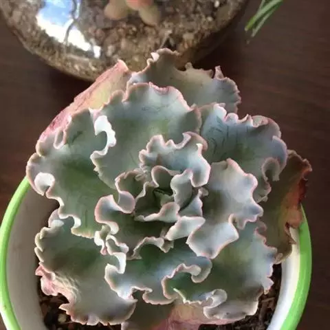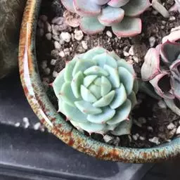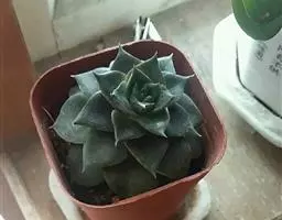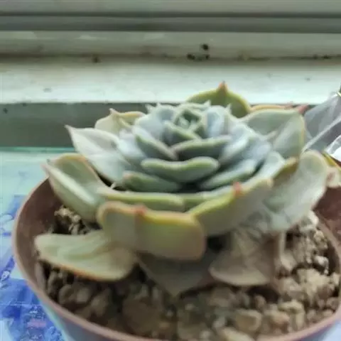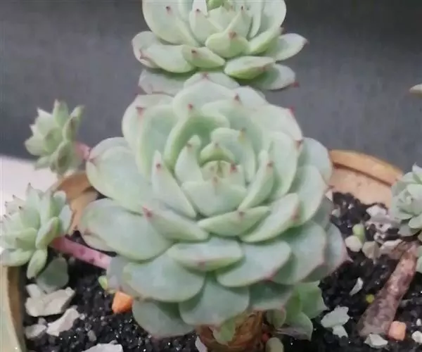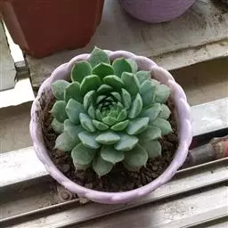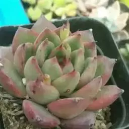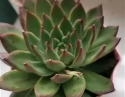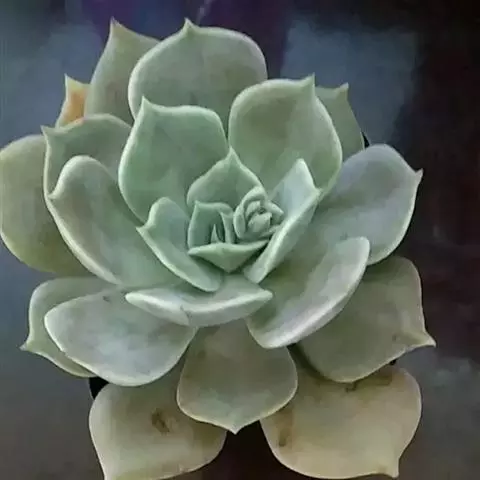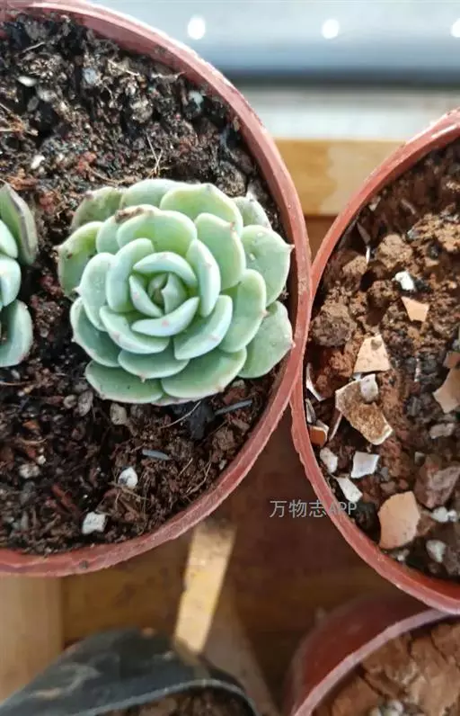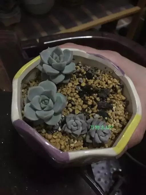 静夜小型品种,单个直径在6~8cm(也有大型静夜,可以长到12cm的直径),叶片浅绿色,叶尖上带一点红润。