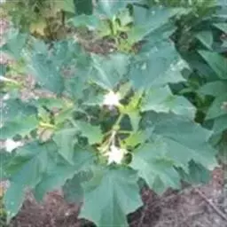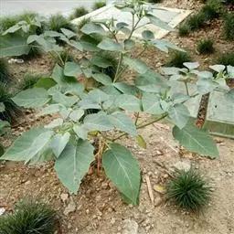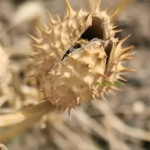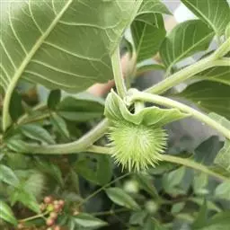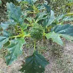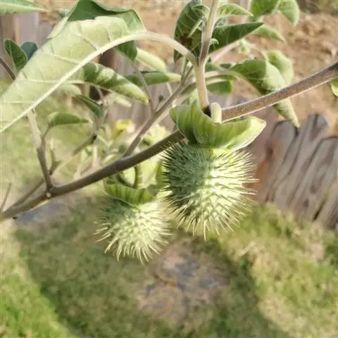 花单生在叶腋或枝叉处;花萼5齿裂筒状,花冠漏斗状,白色至紫色。蒴果直立,表面有硬刺,卵圆形。种子稍扁肾形,黑褐色。