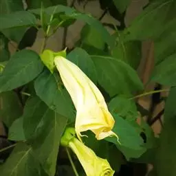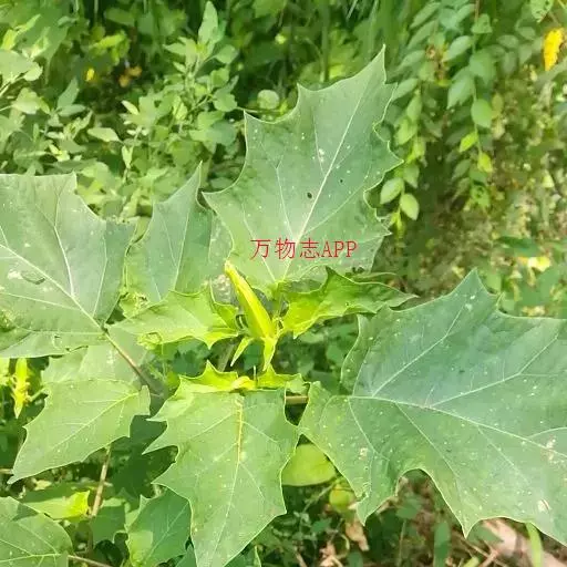 曼陀罗花又叫洋金花、大喇叭花、山茄子,夕颜,果实名为:狗核桃、毛苹果。为茄科植物,原产印度,花期5-9月,果期6-10月,喜温暖、向阳及排水良好的砂质壤土。多野生在田间、沟旁、道边、河岸、山坡等地方,主要危害棉花、豆类、薯类、蔬菜等,有剧毒。