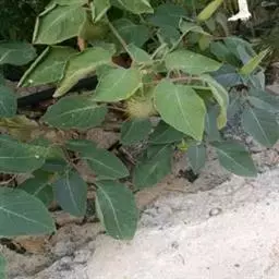 叶宽卵形,边缘有规则波状浅裂,基部常歪斜。花单生叶腋,花冠漏斗形,长7-10cm,筒部淡绿色,上部白色;,有时幼叶上有疏毛。上部常呈二叉状分枝。叶互生,叶片宽卵形,边缘具不规则的波状浅裂或疏齿,具长柄,脉上生有疏短柔毛。