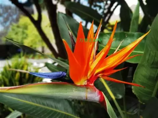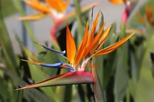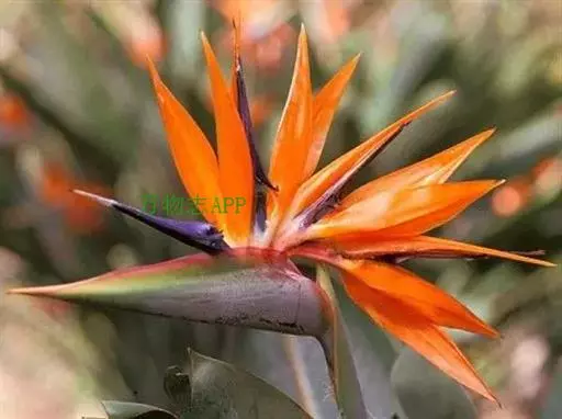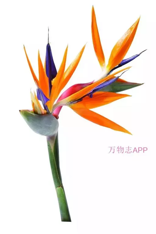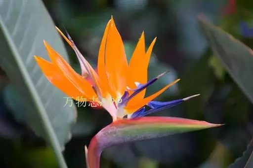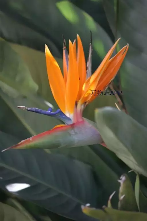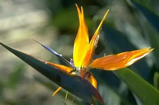 鹤望兰(Strelitzia reginae Aiton)芭蕉科鹤望兰亚科 多年生草本植物,无茎。叶片长圆状披针形,长25-45cm,宽10cm。叶片顶端急尖;叶柄细长。花数朵生于总花梗上,下托一佛焰苞;佛焰苞绿色,边紫红,萼片橙黄色,花瓣暗蓝色;雄蕊与花瓣等长;花药狭线形,花柱突出,柱头3。花期在冬季。