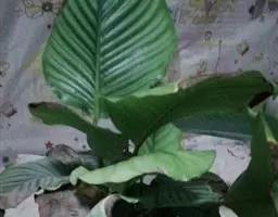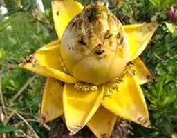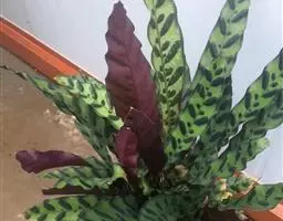 花数朵生于一约与叶柄等长或略短的总花梗上,下托一佛焰苞;佛焰苞舟状,长达20厘米,绿色,边紫红,萼片披针形,长7.5-10厘米,橙黄色,箭头状花瓣基部具耳状裂片,和萼片近等长,暗蓝色;雄蕊与花瓣等长;花药狭线形,花柱突出,柱头3。