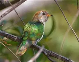 绿嘴地鹃:体形似小鸦鹃,但羽色大致绿灰;嘴绿色,头侧眼的周围有一裸区;后爪弯曲。虹膜赤红色,…