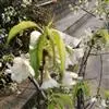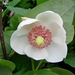 花白色,径10-15厘米,芳香;花梗粗短,被长柔毛,离花被片下1厘米处具包片脱落痕,花被片9-12 (17),厚肉质,外轮3片淡绿色,长圆状倒卵形,长8-10厘米,宽4-5厘米,盛开时常向外反卷,内两轮白色,倒卵状匙形,长8-8.5厘米,宽3-4.5厘米,基部具爪,最内轮7-8.5厘米,花盛开时中内轮直立;雄蕊约72枚,长2-3厘米,花药长1.2-1.5厘米,内向开裂,花丝长4-12毫米,红色;雌蕊群椭圆状卵圆形,长2.5-3厘米。
