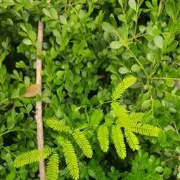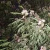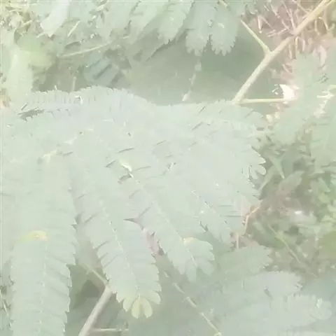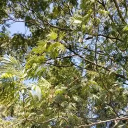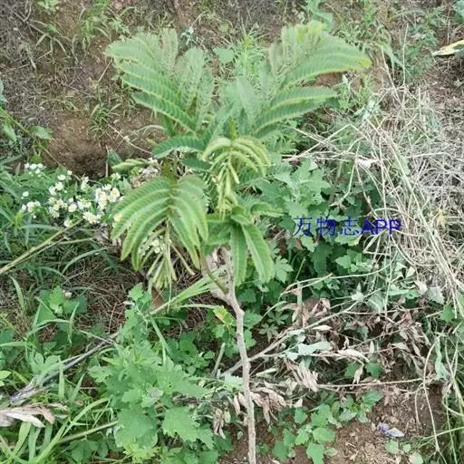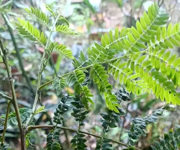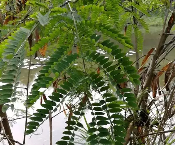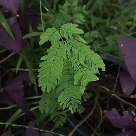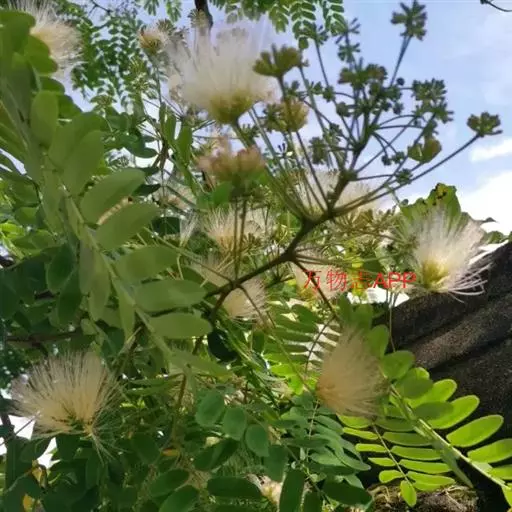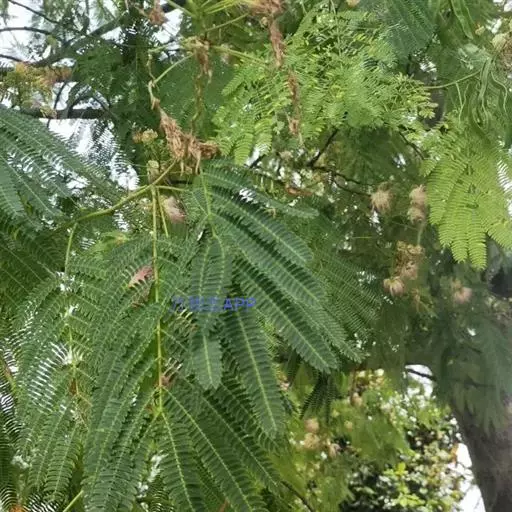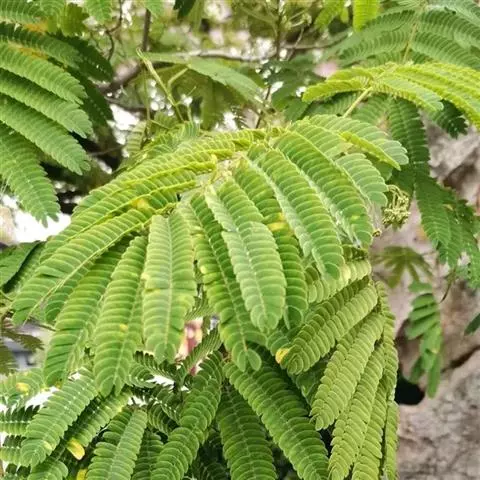 二回羽状复叶,总叶柄近基部及最顶一对羽片着生处各有1枚腺体;羽片4-12对,栽培的有时达20对;小叶10-30对,线形至长圆形,长6-12mm,宽1-4mm,向上偏斜,先端有小尖头,有缘毛,有时在下面或仅中脉上有短柔毛;中脉紧靠上边缘。